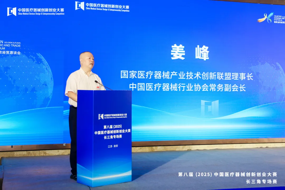国家医疗器械产业技术创新联盟理事长、中国医疗器械行业协会常务副会长姜峰在发言中,首先诚挚感谢江苏省药监局、淮安市政府及清江浦区政府以及大赛主办方“三方协同”对本次大赛的支持。介绍了中国医疗器械创新网创业大赛是国内参赛项目最多、专业性最强、行业影响力最大、转化落地效果最突出的全国性专业赛事。本届大赛服务进一步升级,不仅提供自有基金、代工平台、设计平台等配套支持,并与工信部、科技部深化交流,助力国际科研合作与项目落地。大赛组委会更以覆盖赛前、赛中、赛后的全周期服务,为医疗器械创新网项目蓬勃发展保驾护航。